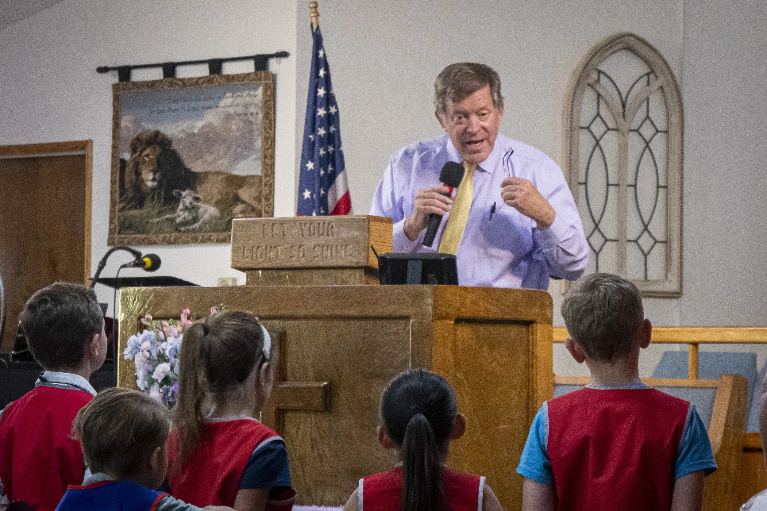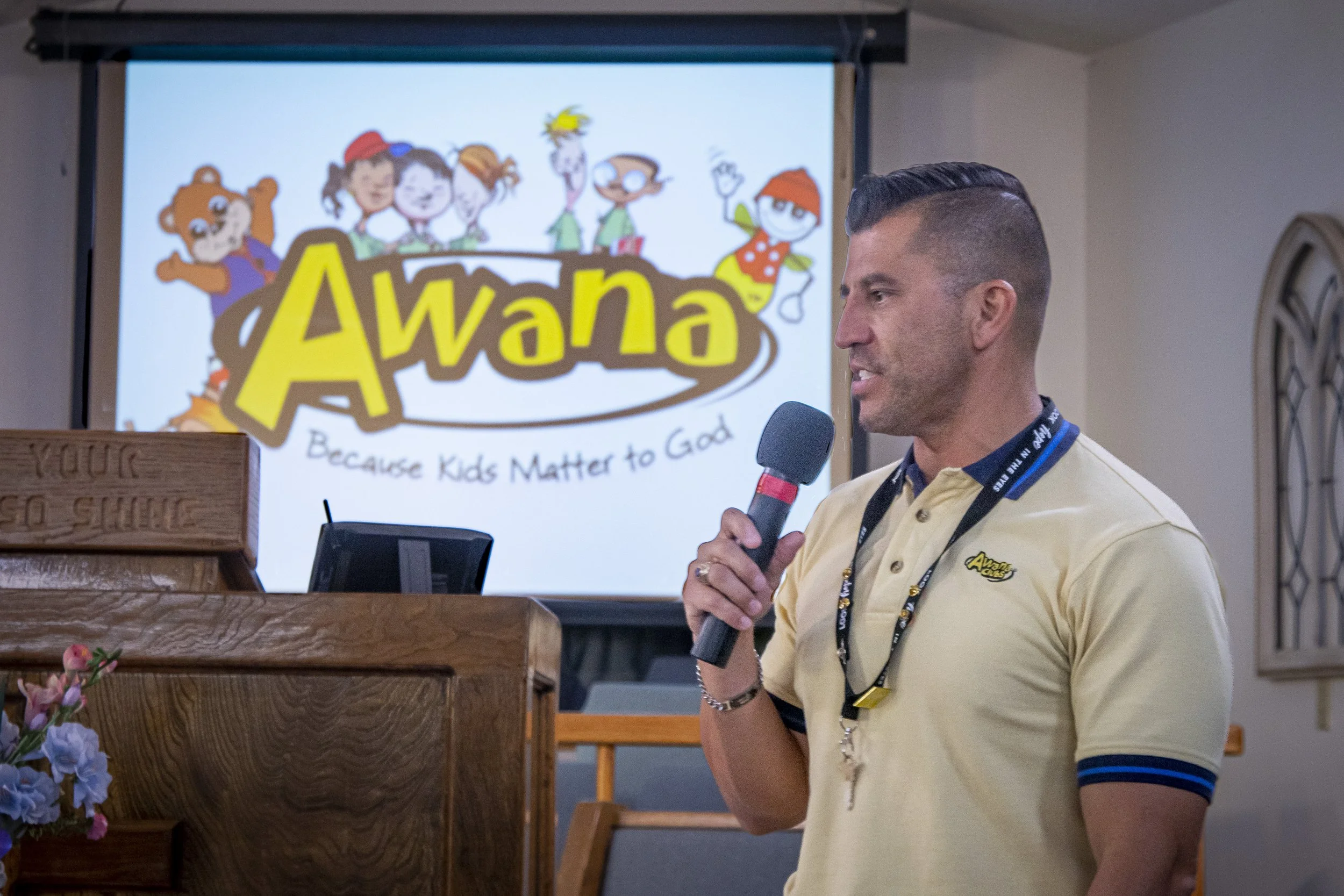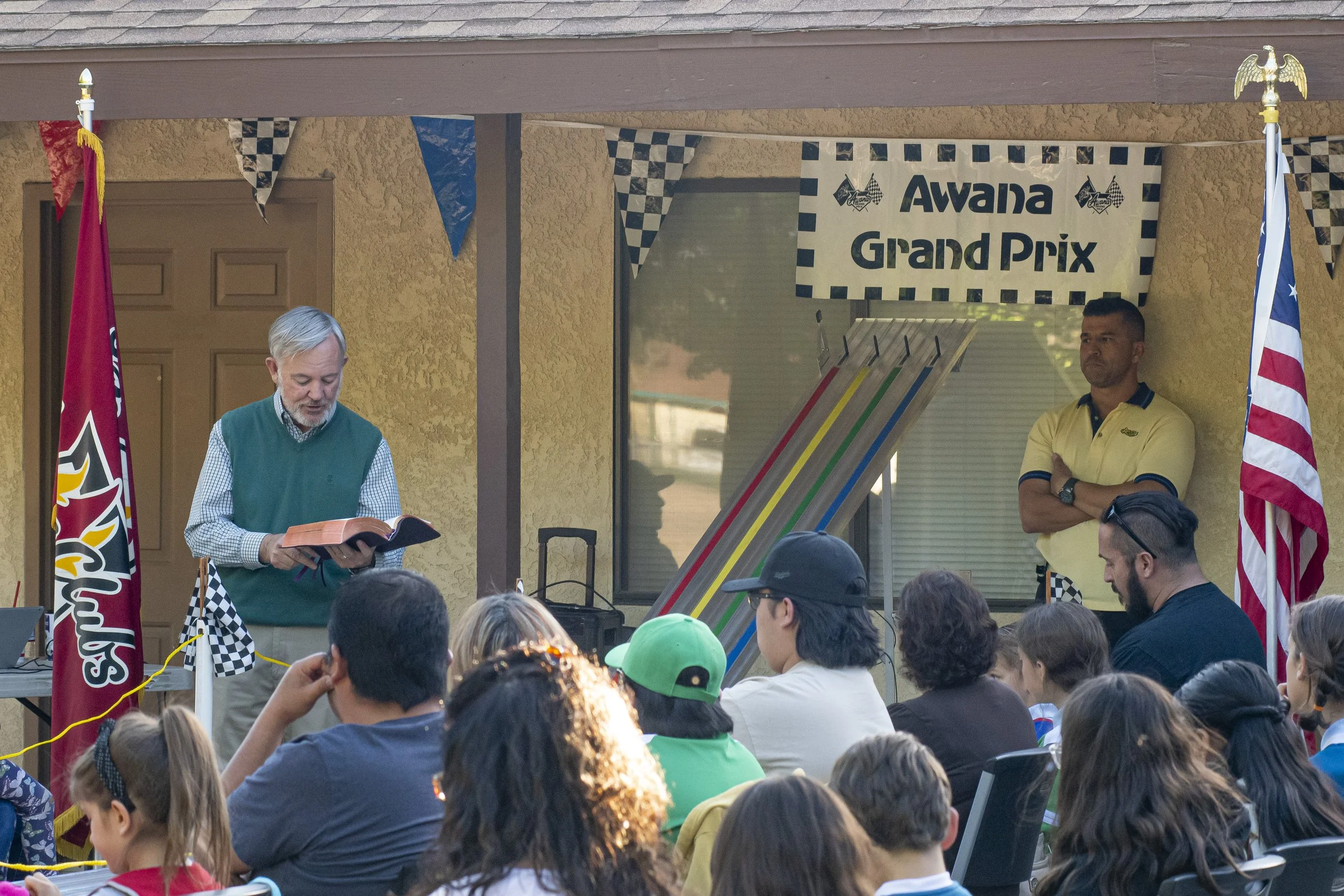Pastor Eric Engleman speaking to the Sparks at Awards Night in AWANA.
